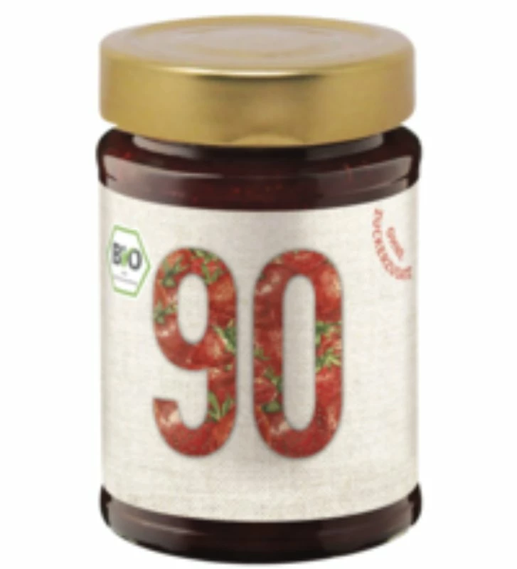 Sibani Fruchtaufstrich Erdbeere 90%. Der vegane Fruchtaufstrich mit Erdbeere hat einen Fruchtanteil von 90% und ist mit Erythritol gesüßt. Auf Brot, Brötchen, Croissant streichen oder einen Klecks davon in den Joghurt geben.