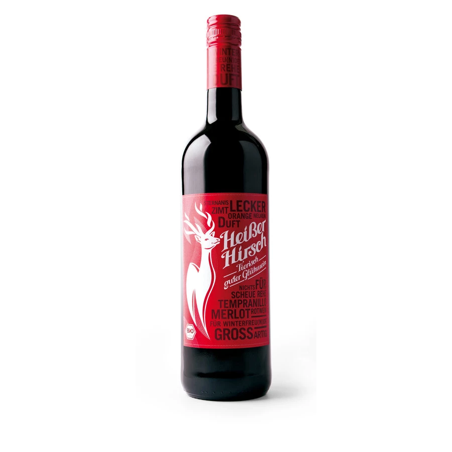 HEISSER HIRSCH ist Qualitätsglühwein mit Charakter. Er schmeckt mindestens so gut wie er aussieht – und dass er der schönste seiner Art ist, bleibt unbestritten. Sein Körper bildet ein dunkelroter, fruchtig-kräftiger Bio-Rotwein, der mit hochwertigen und 100% natürlichen Bio-Gewürzextrakten