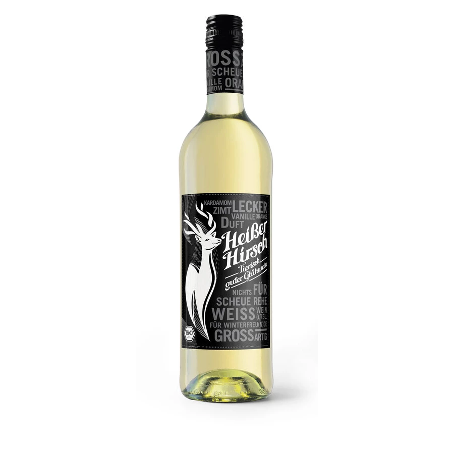 HEISSER HIRSCH (weiß) ist Qualitätsglühwein mit Charakter. Er schmeckt mindestens so gut wie er aussieht – und dass er der schönste seiner Art ist, bleibt unbestritten. Zutaten: Weißwein (100% Bio-Airén-Trauben), Bio-Zucker, natürliche Bio-Gewürzextrakte aus Zimt, Nelken, Vanilleschoten, Kardamom, Piment, Macisblüten, Orangen und Zitronen. HEISSER HIRSCH mag Tiere und ist vegan.