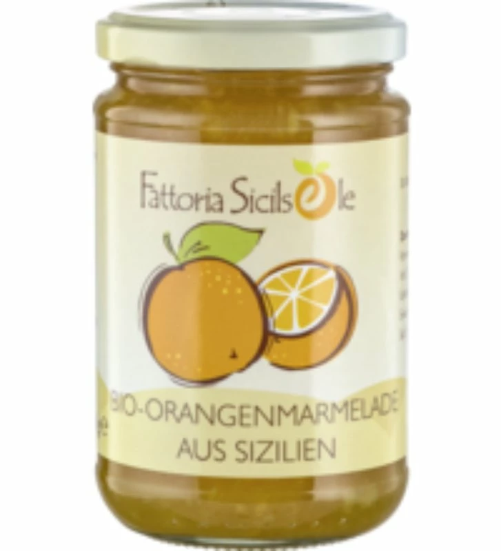 Fattoria Sicilsole Bio Orangenmarmelade. Die aus Sizilien stammende Orangenmarmelade ist mit einem Fruchtanteil von 45 g pro 100 g Marmelade ein fruchtiger Frühstücksspaß. Probieren Sie die Marmelade auf Ihrem Butterbrot oder auch zum Verfeinern von Desserts oder Saucen.
